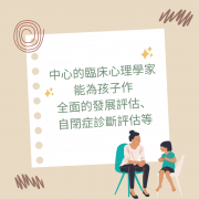 本中心的臨床心理學家能為孩子作全面的發展評估(包括:智力評估、自閉症診斷評估、專注力不足過度活躍症、整體發展評估、讀寫障礙評估等),評估只需輪候1-2個星期